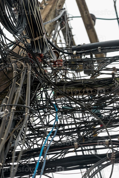 Ближайшее изображение случайно висящих проводов на электрических столбах в Таиланде