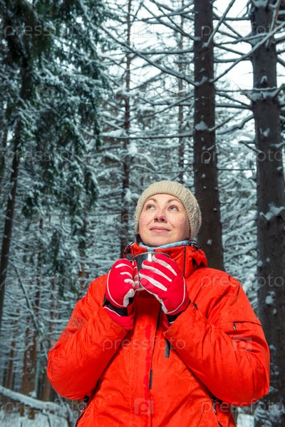 Мечтательная девушка с горячей кружкой чая в зимнем лесу