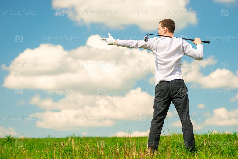 Игрок в гольф, показывающий свою руку к пространству на левой раме, мужчина с клюшкой
