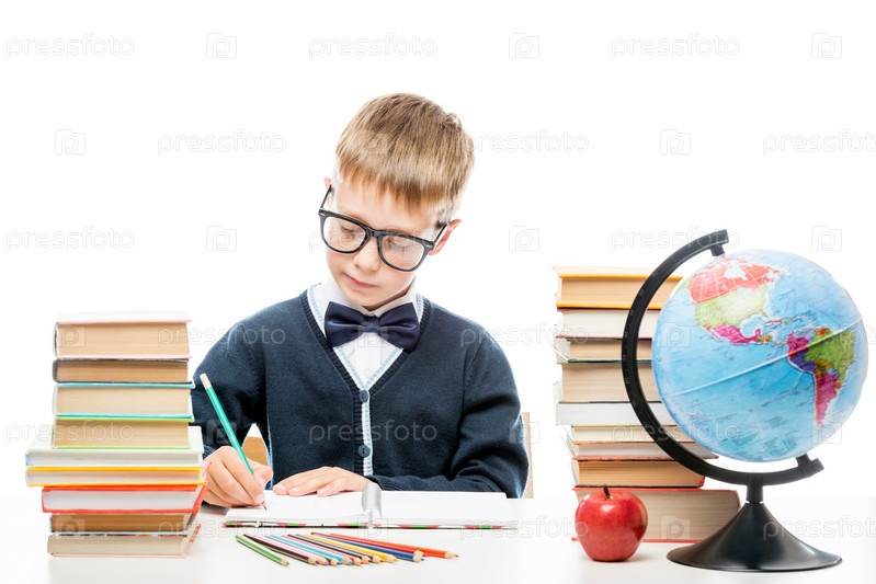 Очень умный школьник в очках с книгами за столом на белом фоне