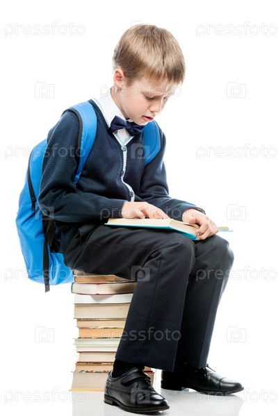 Студент сидит на куче книг и читает учебник на белом фоне