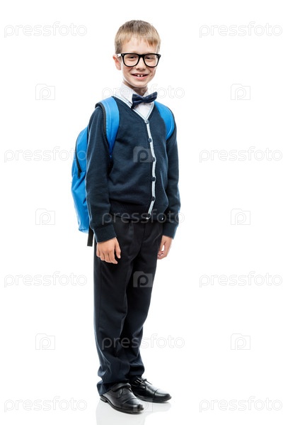 Школьник в школьной форме с рюкзаком на полном протяжении портрет изолирован