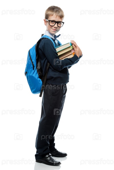 Портрет школьника с мячом и учебниками на белом фоне в студии