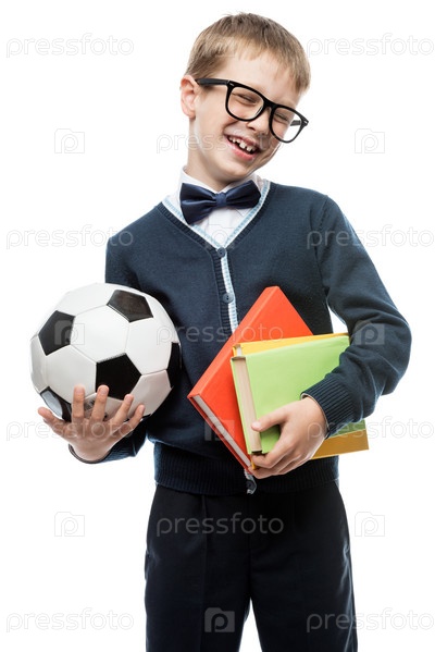 Портрет смеющегося умного школьника с учебником по футбольному мячу на белом фоне изолирован