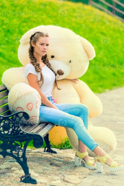 Молодая красивая девушка в парке со своим огромным плюшевым медведем на скамейке