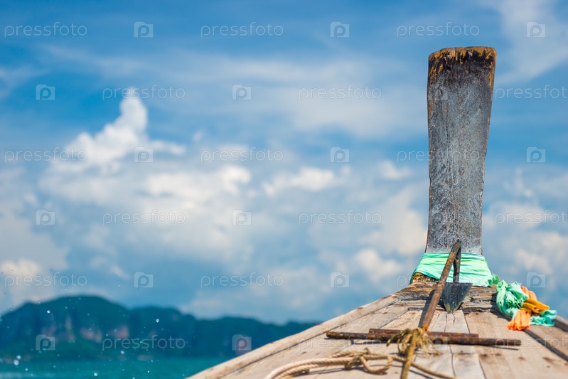 Близкий план деревянной тайской лодки с носом и облаками в кадре