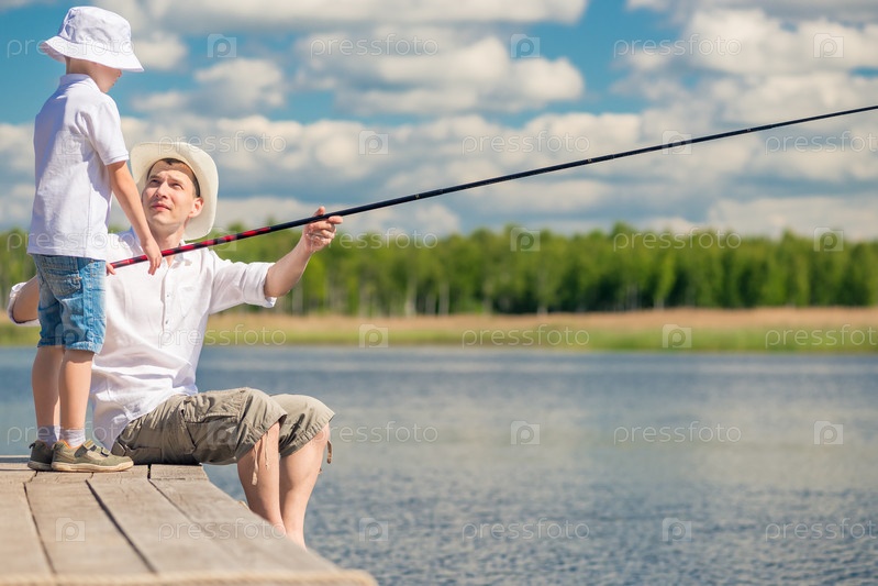 Рыбаки отец и сын на пирсе ловят рыбу в озере