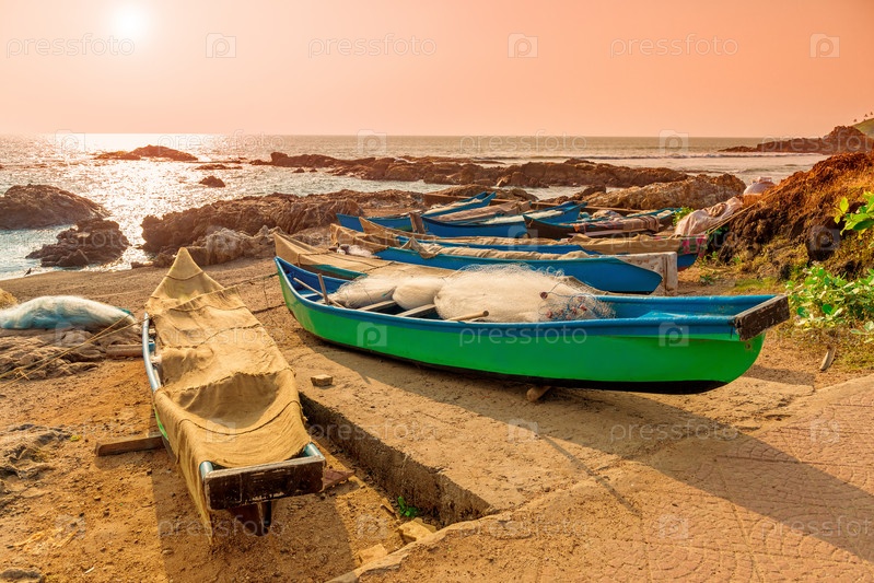 Рыболовные лодки с сетями на берегу океана