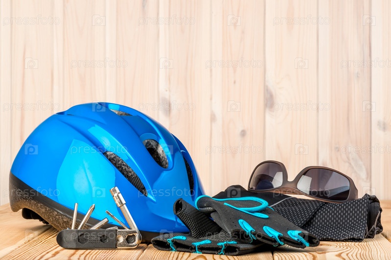 Шлем, перчатки и велосипедные аксессуары на деревянном фоне