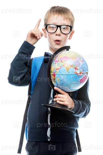 Эмоциональный школьник с глобусом имеет хорошую идею, портрет изолирован на белом фоне