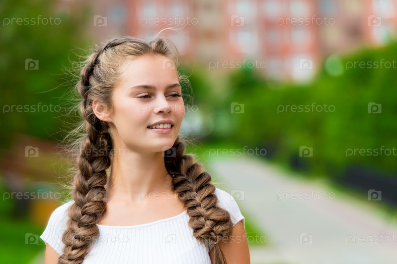 Молодая женщина в белой футболке с двумя скобами в парке, горизонтальный крупный портрет