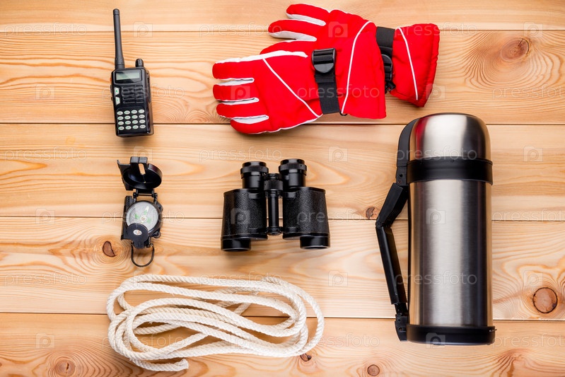 Вид сверху на деревянном фоновом оборудовании для экстремального туризма