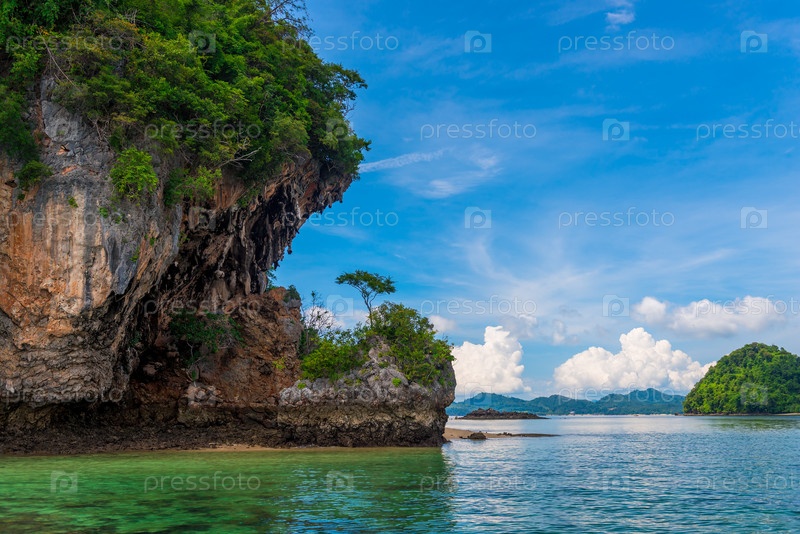 Высокая скала в море, красивый морской пейзаж в солнечный день, Тайландская провинция Краби