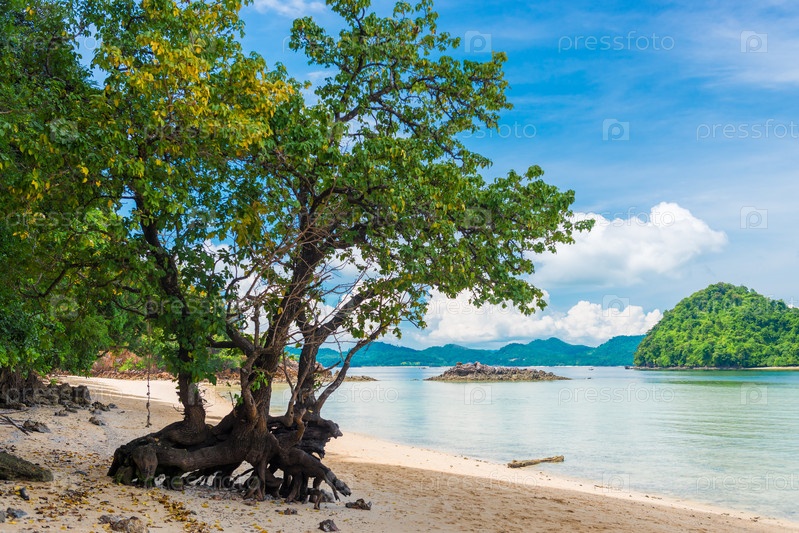 Красивое дерево с ветвистыми корнями на песчаном пляже необитаемого острова Таиланд