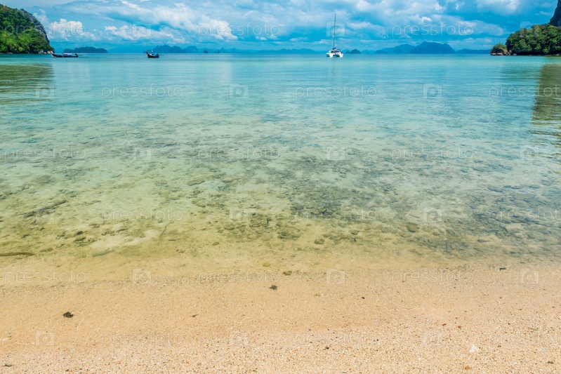 Спокойное Андаманское море, вид с пляжа на море и горизонт