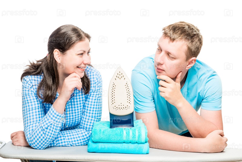 Портрет супружеской пары на фоне доски для глазки, изолированное железо и полотенца