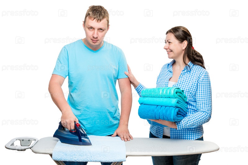 Молодая супружеская пара во время глажки одежды, портрет изолирован на белом фоне