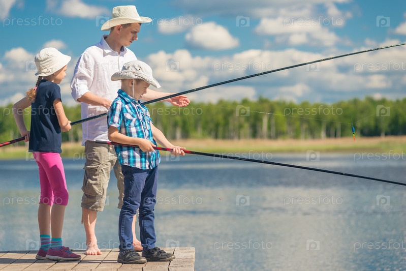 Папа с дочерью и сыном на рыболовных выходных