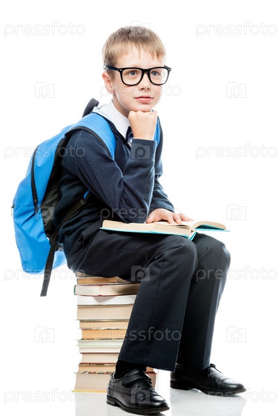 Мальчик в школьной форме с книгами на белом фоне в студии