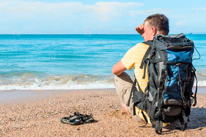 Путешественник с рюкзаком, отдыхающий на пляже возле моря в Таиланде