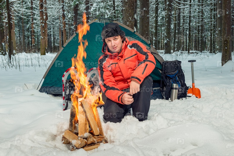 Турист в зимнем лесу при экстремальных условиях зажигает огонь
