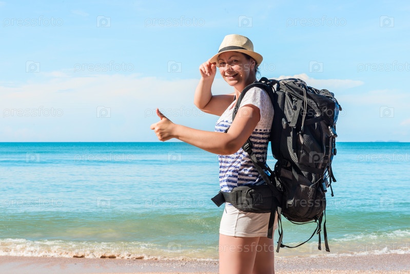 Молодая туристка с рюкзаком счастлива на пляже в Таиланде