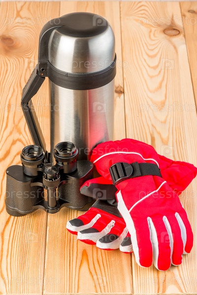 Теплые перчатки, бинокль и термос с чаем готовы к трудному походу, предметы на деревянном фоне