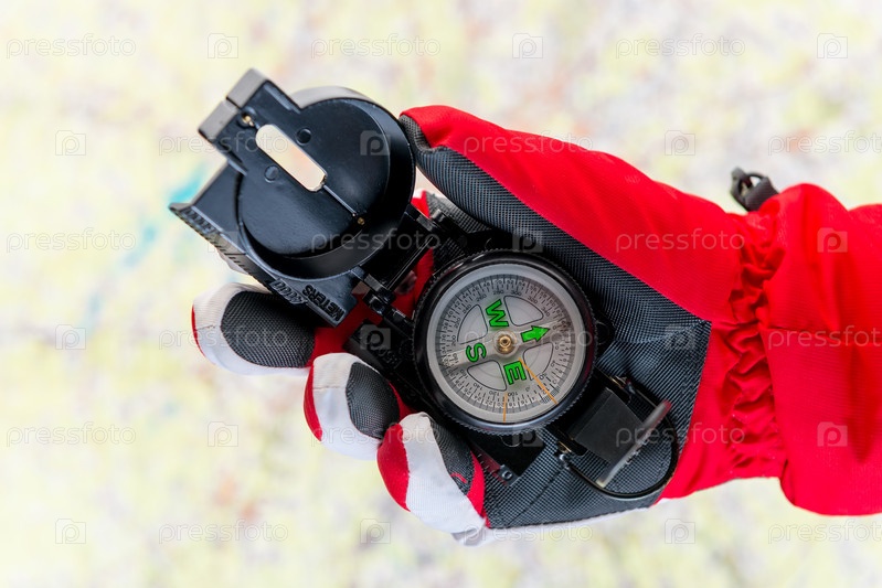 Концептуальная фотография - поиск пропавших без вести туристов в горах зимой - рука в перчатке держит компас на фоне карты