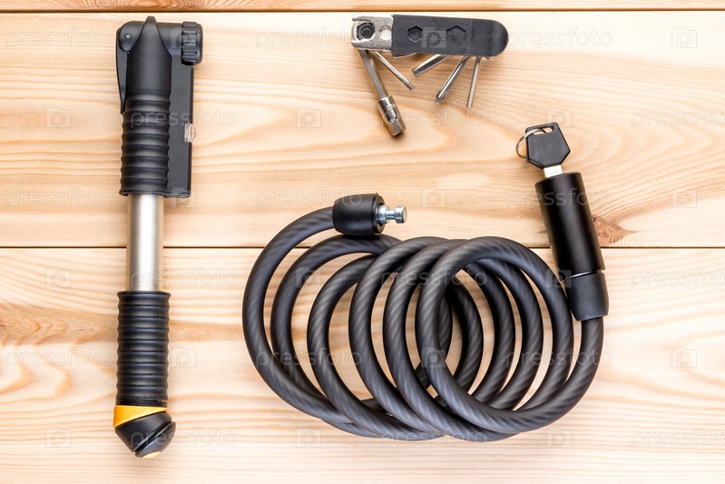 Насос, замок и набор инструментов для велосипеда на деревянных досках top view