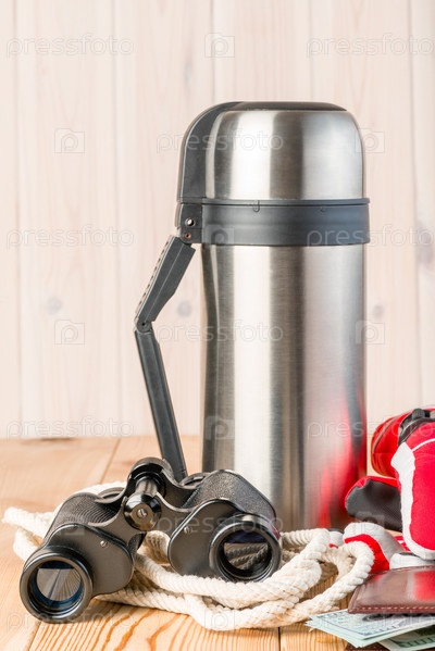 Термос с горячим чаем, биноклями, веревкой и перчатками для опасного зимнего похода на деревянном фоне