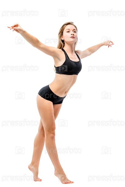 Красивая спортсменка делает упражнения по расслаблению на белом фоне