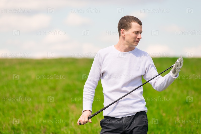 Молодой гольф-игрок осматривает свою клюшку перед игрой