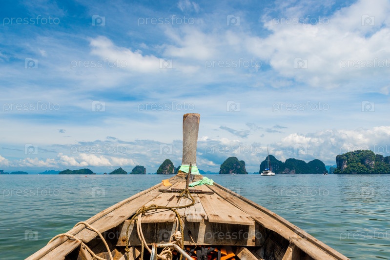 Близкий план тайской деревянной лодки, плывущей к красивым скалам в море, Таиланд, вид на остров Краби