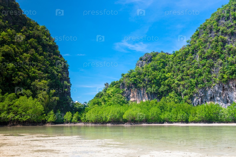 Мелкий морской залив при отлива в красивом тропическом месте Таиланда, курорт Краби