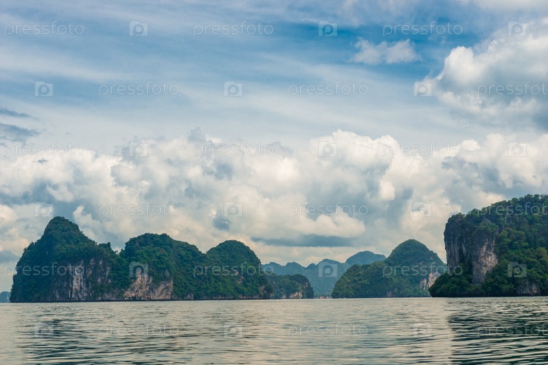 Пейзаж - море, зеленые скалы и красивые облака в тропическом раю на курорте в Таиланде