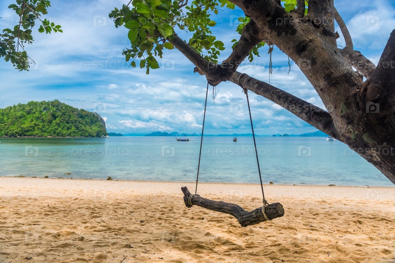 Ближайший снимок качели на дереве на песчаной пирамиде на фоне моря, Таиланд