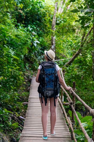 Девушка-туристка с большим рюкзаком в Азии на деревянной тропе