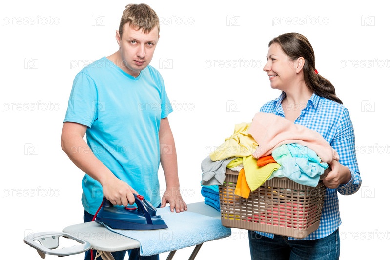 30-летняя пара гладит вещи железом, снимает в студии на белом фоне