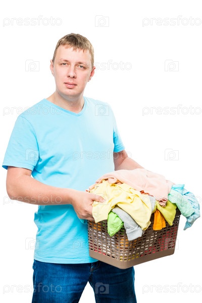 Вертикальный портрет мужчины с корзиной чистой ткани на белом фоне