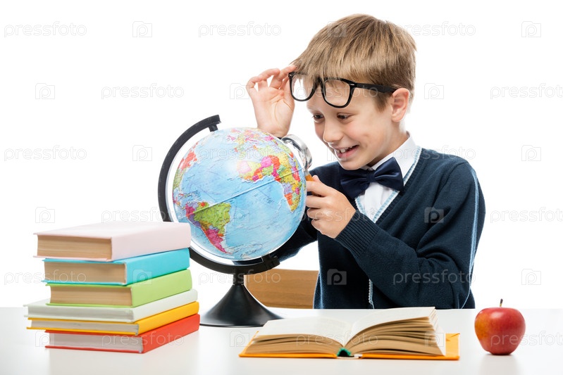 Портрет счастливого школьника с лупой, изучающего глобус на белом фоне