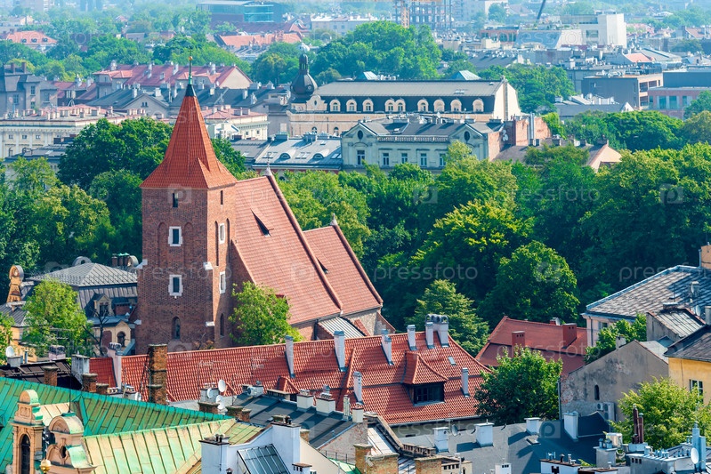 Католическая кирпичная церковь сверху и крыши домов в Кракове в солнечный день