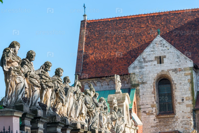 Красивая скульптура 12 апостолов на фоне католической церкви в Кракове