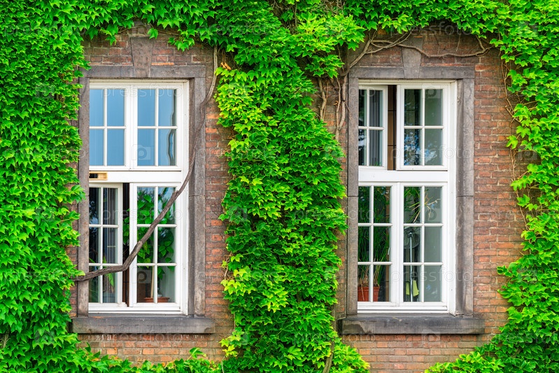 Два окна и плотная лоза на кирпичной стене