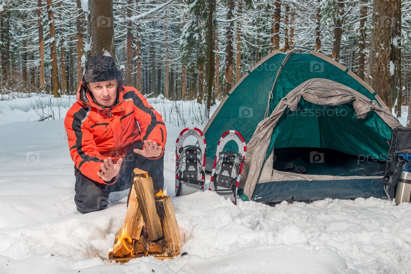 Замерзший потерянный турист возле палатки согревает руки у костра