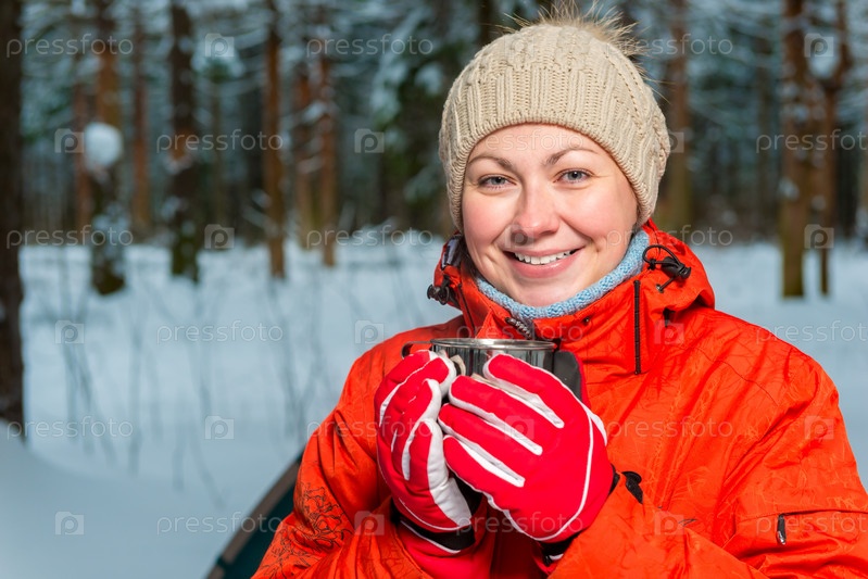 Счастливая девушка с кружкой чая в зимнем лесу