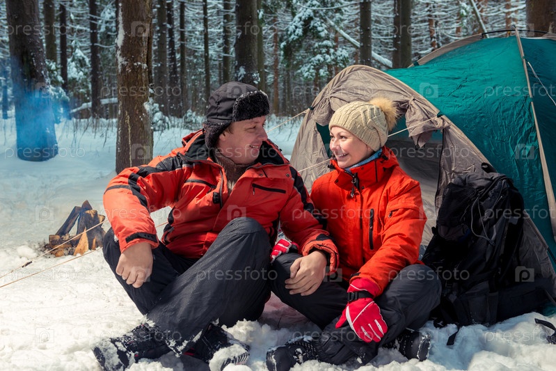 Счастливая пара активных туристов на открытом воздухе в зимнем лесу для похода