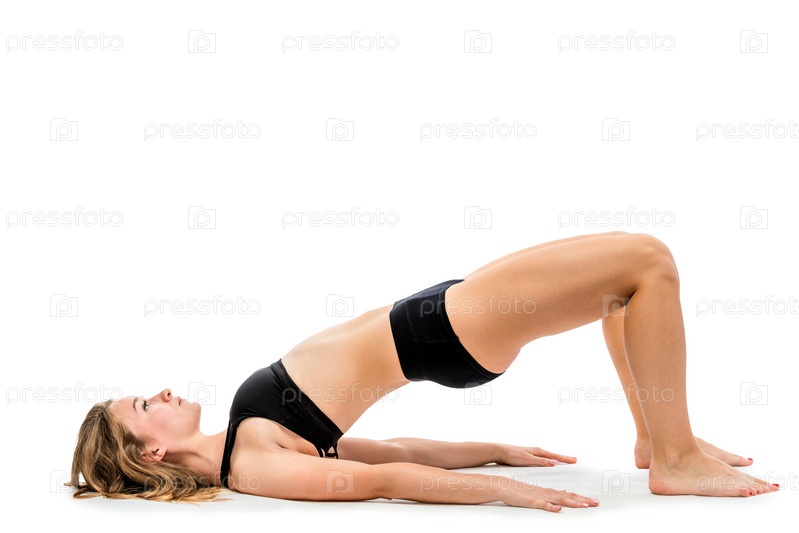 Молодая девушка делает упражнения в нижнем белье на белом фоне