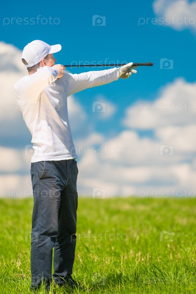 Голфист в шапке с клюшкой для гольфа на поле позирует