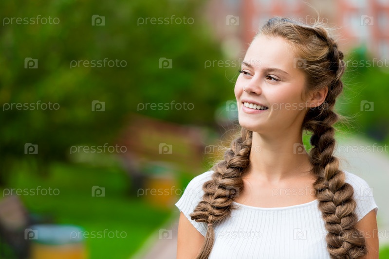 Портрет красивой молодой девушки в белой футболке с двумя косичками в парке