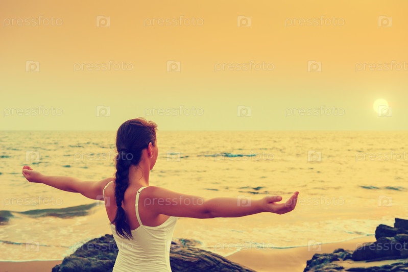 Девушка с раздвинутыми руками на закате у моря